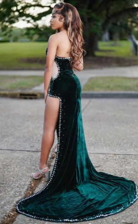 Mermaid Velvet Prom Dress V Neck Spaghetti Strap Beaded High Split Formal Dress
