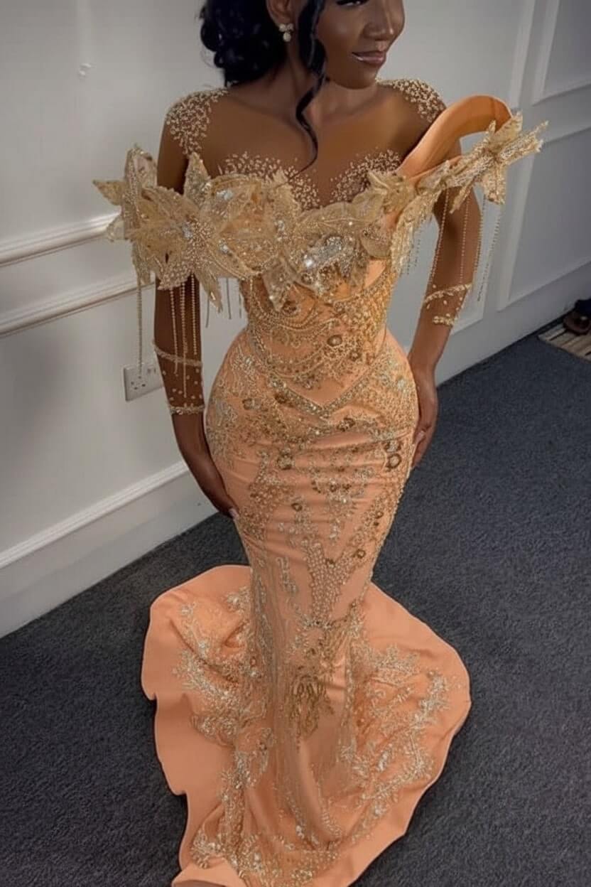 Luxurious long sleeves adorned with intricate beading add sophistication and coverage, while delicate 3D floral appliques bring romantic dimension and texture throughout the gown. The vibrant yellow hue radiates warmth and confidence, ensuring you stand out at prom, galas, weddings, or any formal celebration.